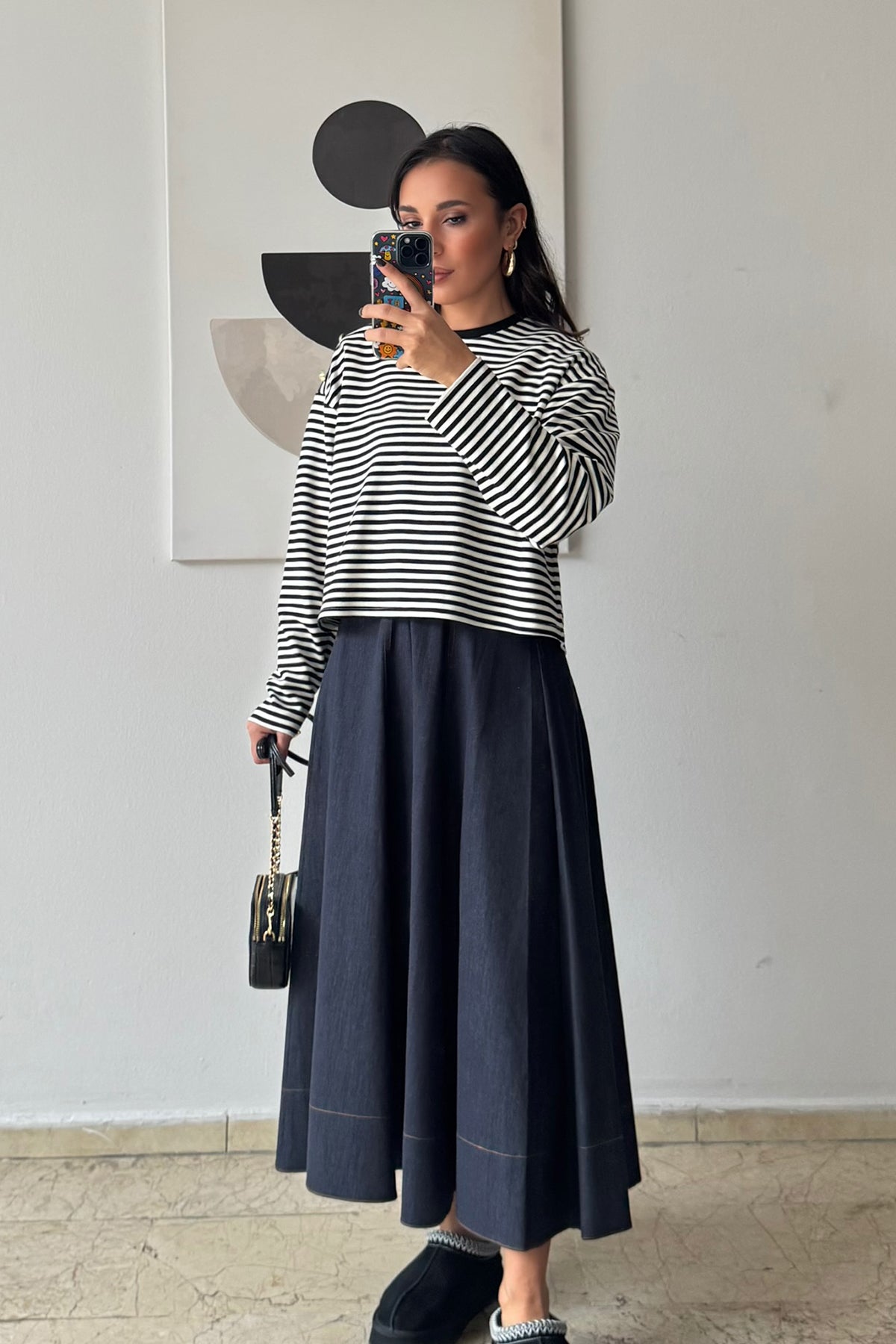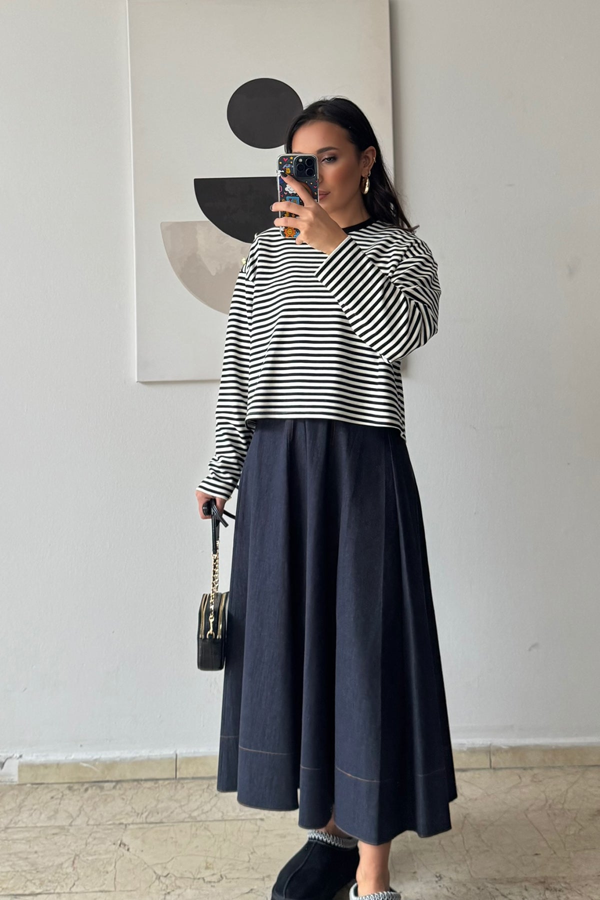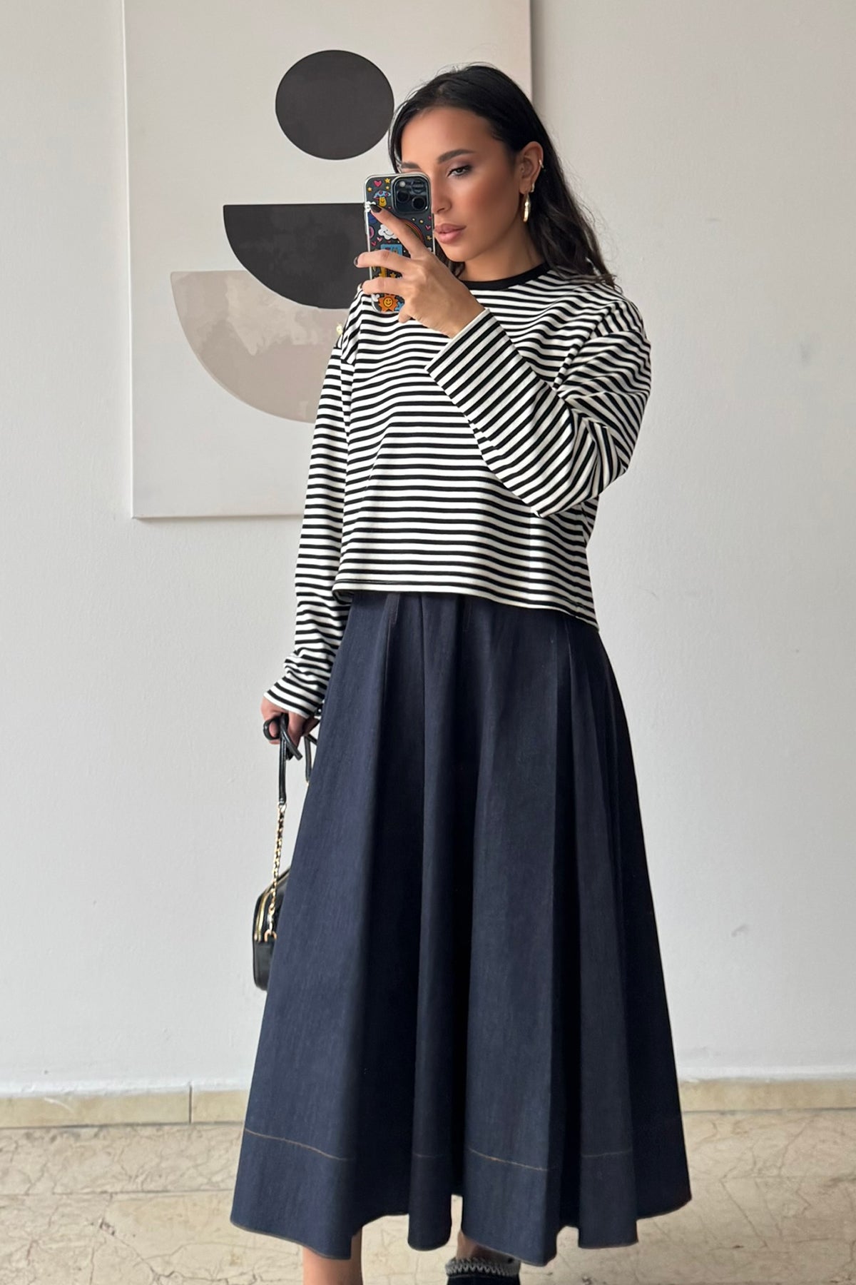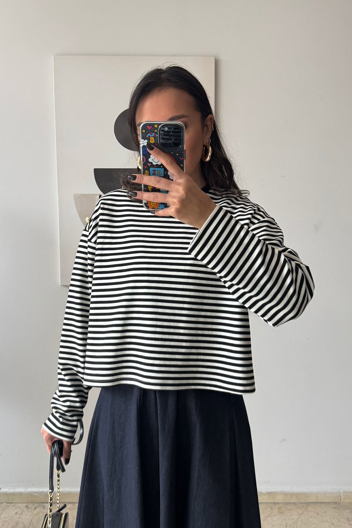 Zamansız çizgi deseni ve omuz kısmındaki 3 adet light gold düğme detayıyla sade şıklığı öne çıkaran bu sweat, her dolabın olmazsa olmaz parçası!