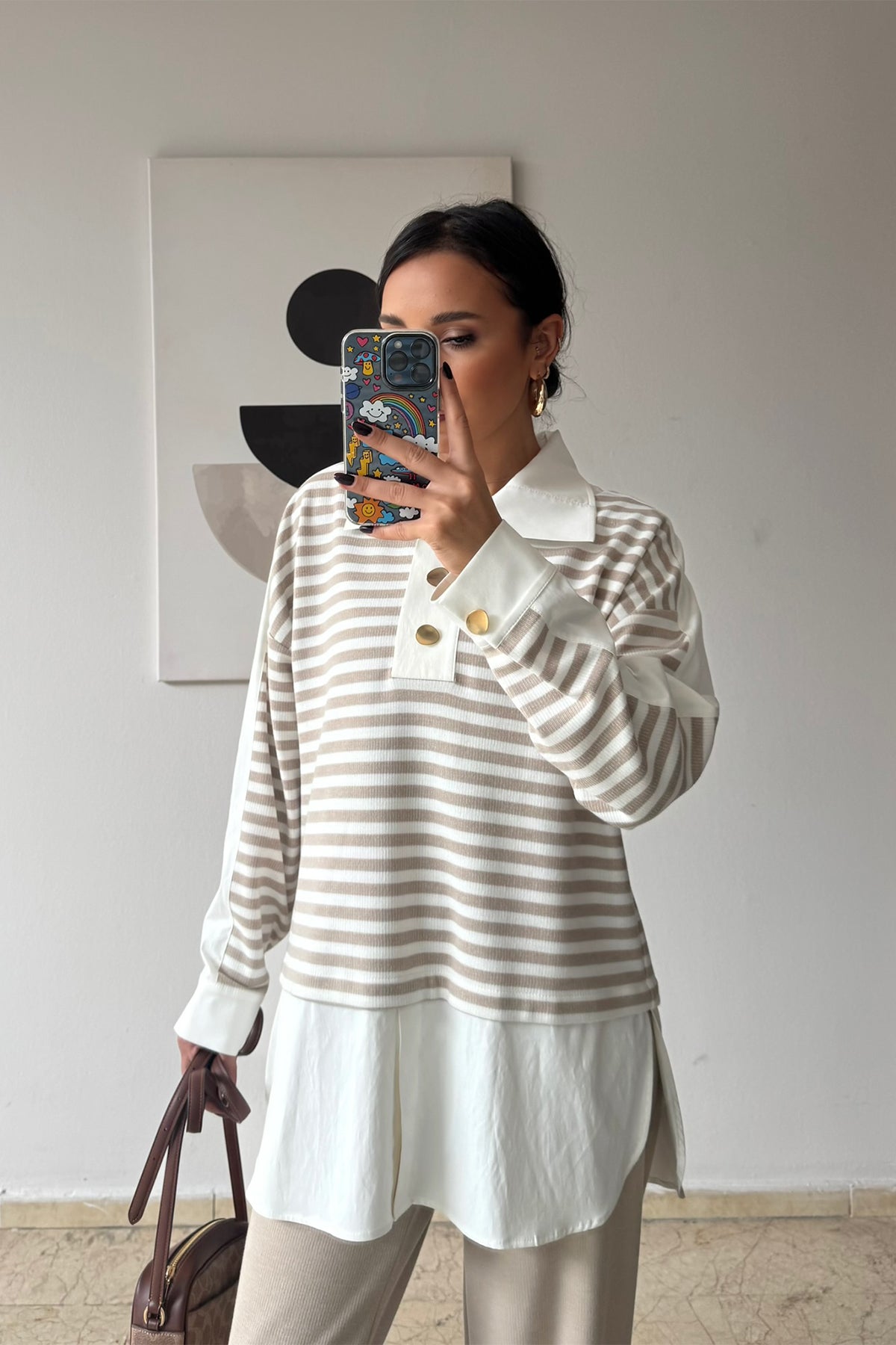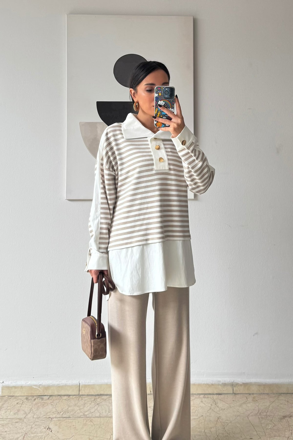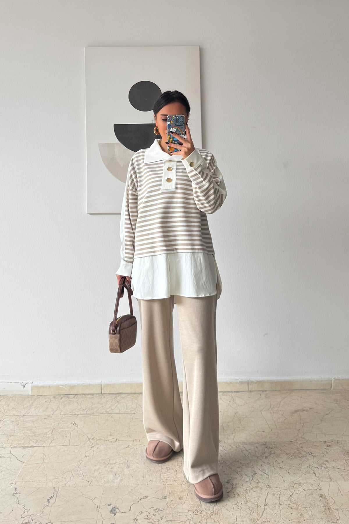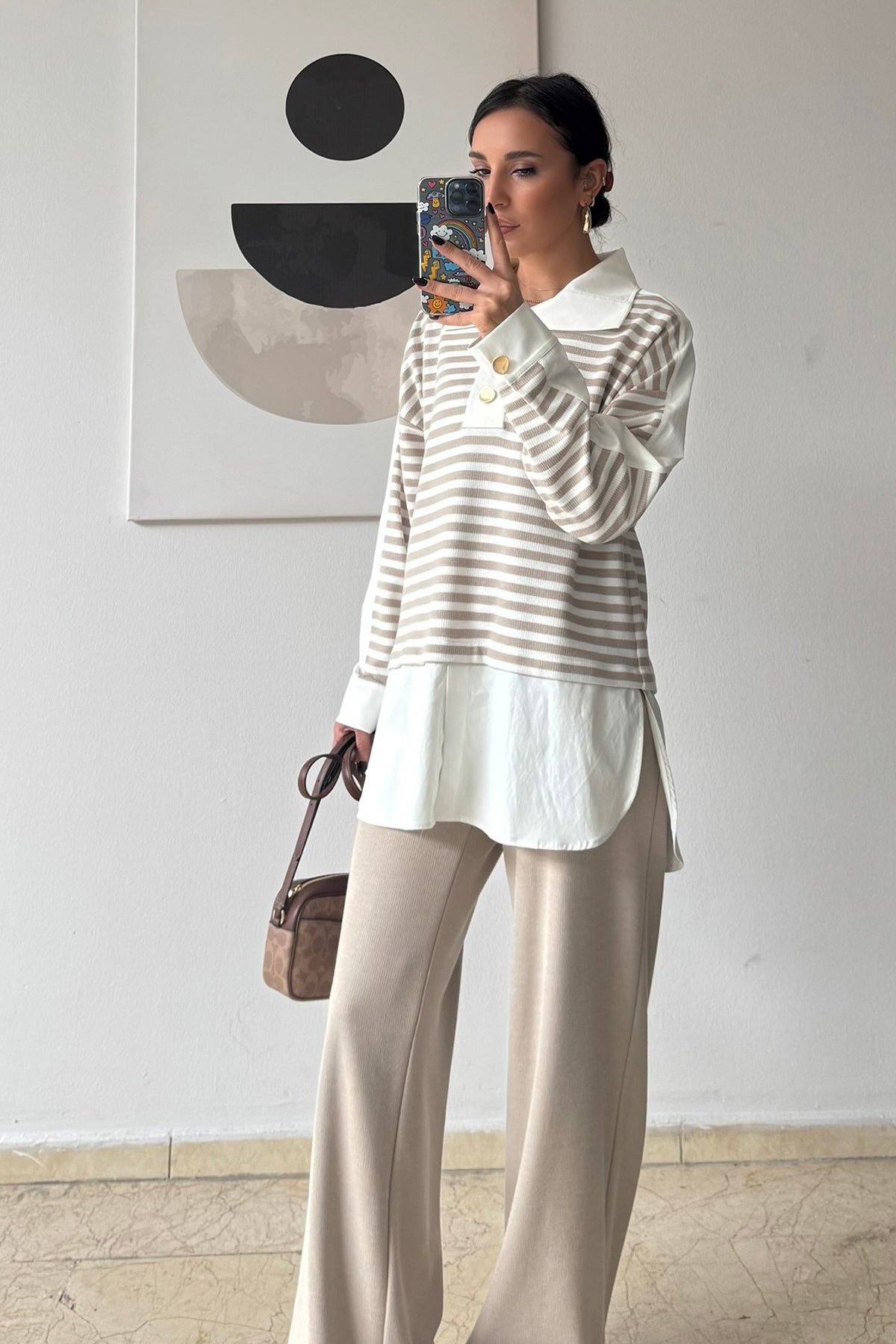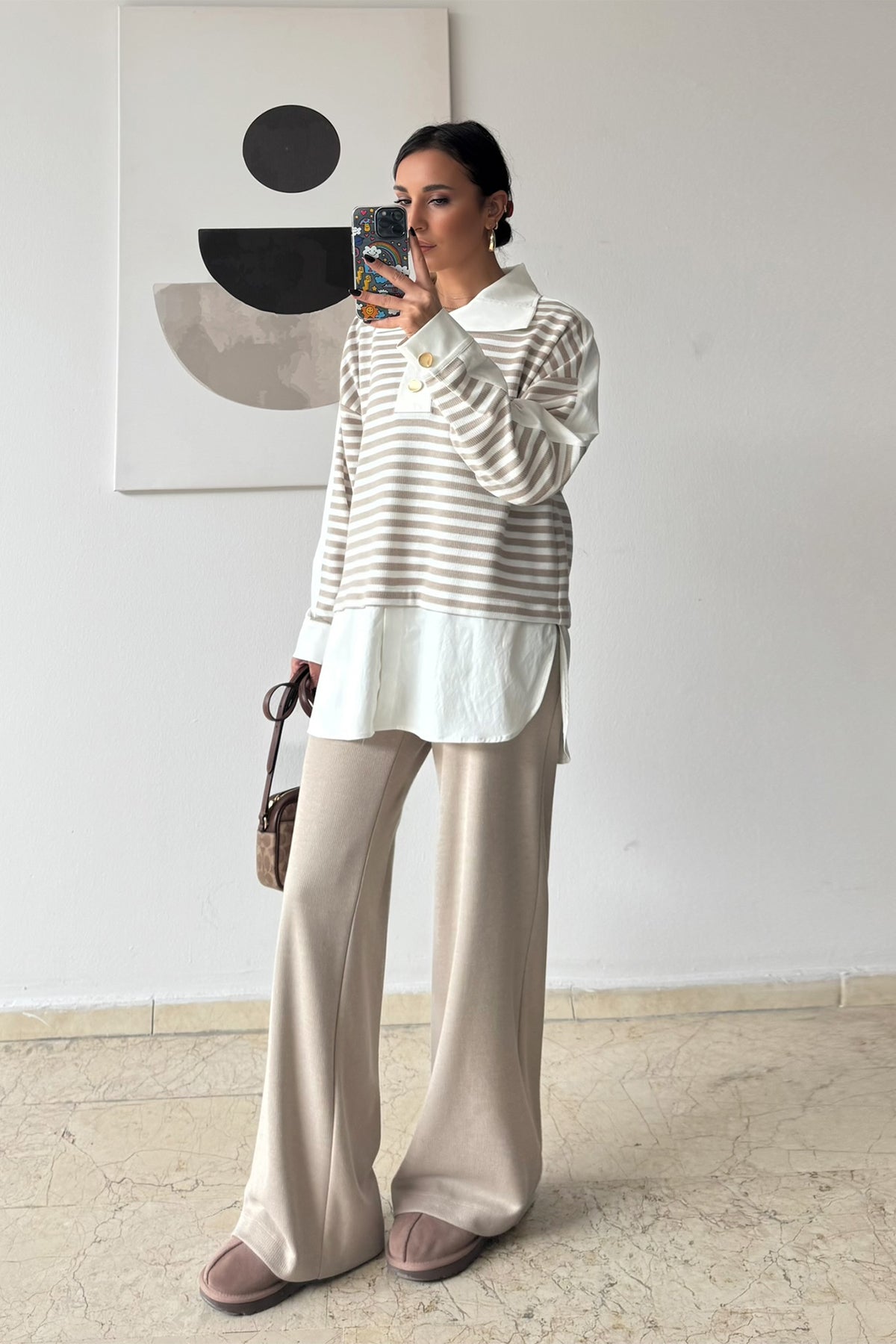 Rahatlığı ve şıklığı bir araya getiren bu iki parçalı takım, hem günlük kombinlerde hem de şık davetlerde modern bir duruş sergiliyor. Üst parçası çizgili triko kumaşı ve gömlek yaka-poplin detaylarıyla dikkat çekerken, alt parçada yer alan geniş paçalı pantolon ise konforlu kalıbıyla tamamlayıcı bir görünüm sunuyor.