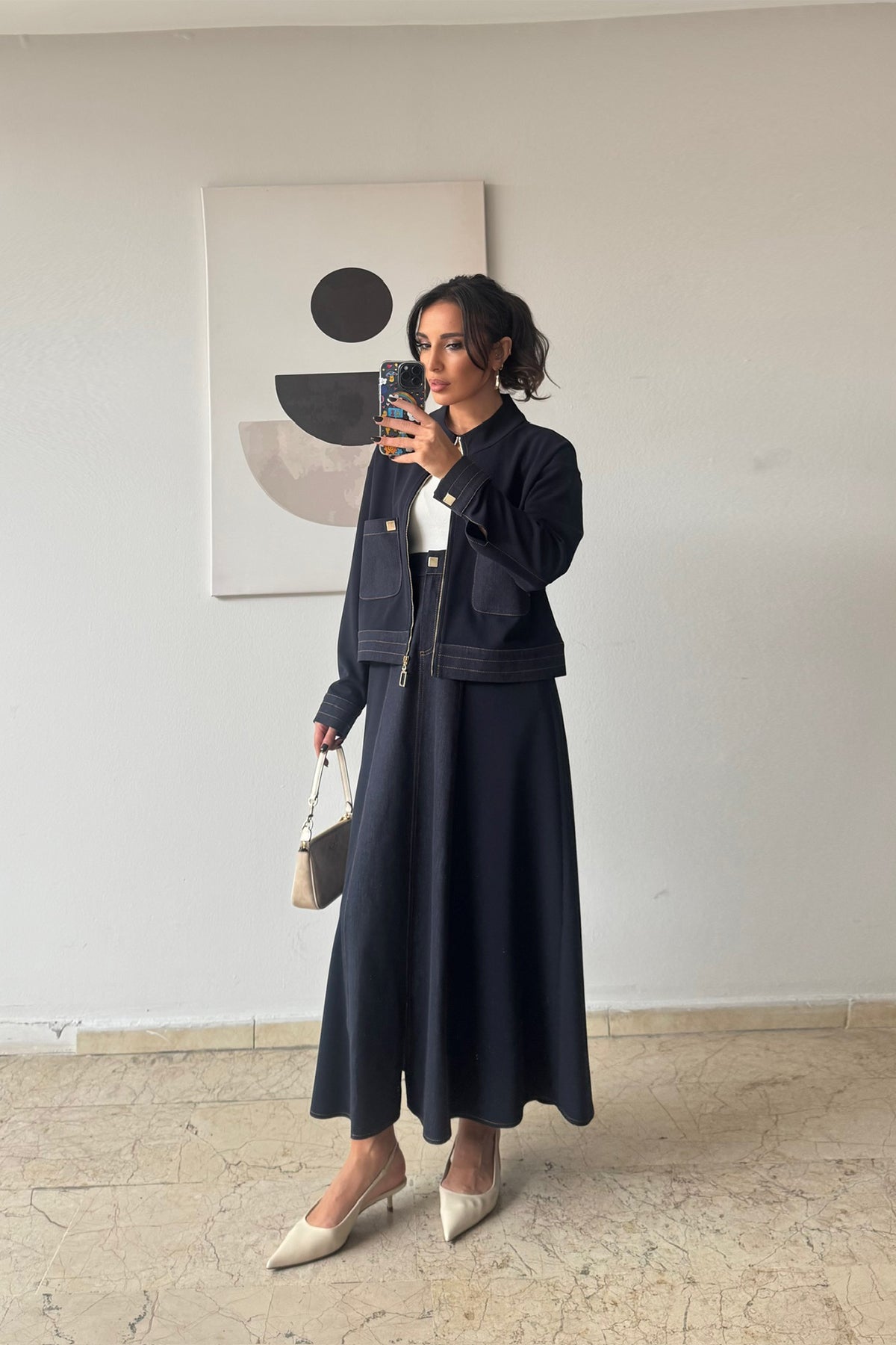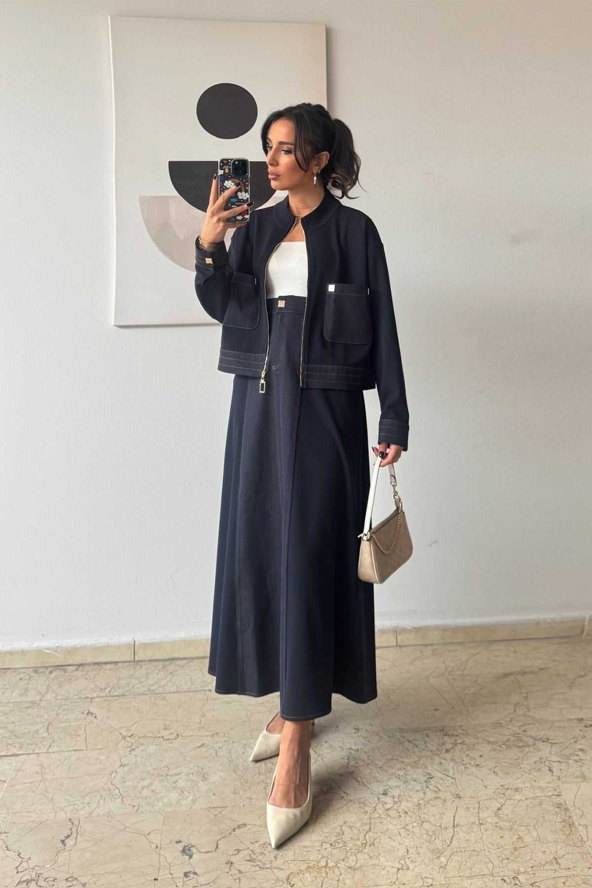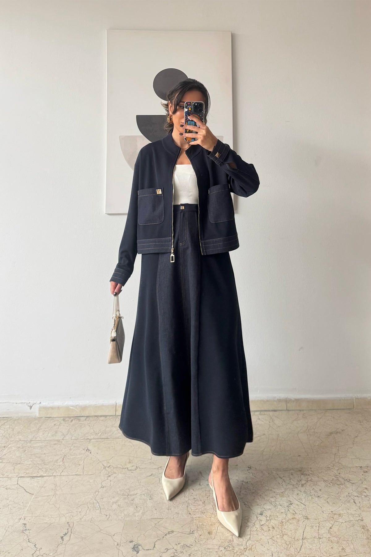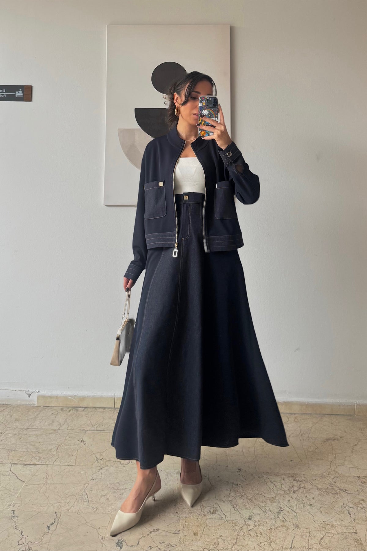 Günlük şıklığın modern yorumu: Kot detaylarla zenginleştirilmiş bu etekli takım, hem rahatlığı hem de tarzı bir arada sunuyor. Spor-şık kombinleri sevenler için ideal bir seçenek.