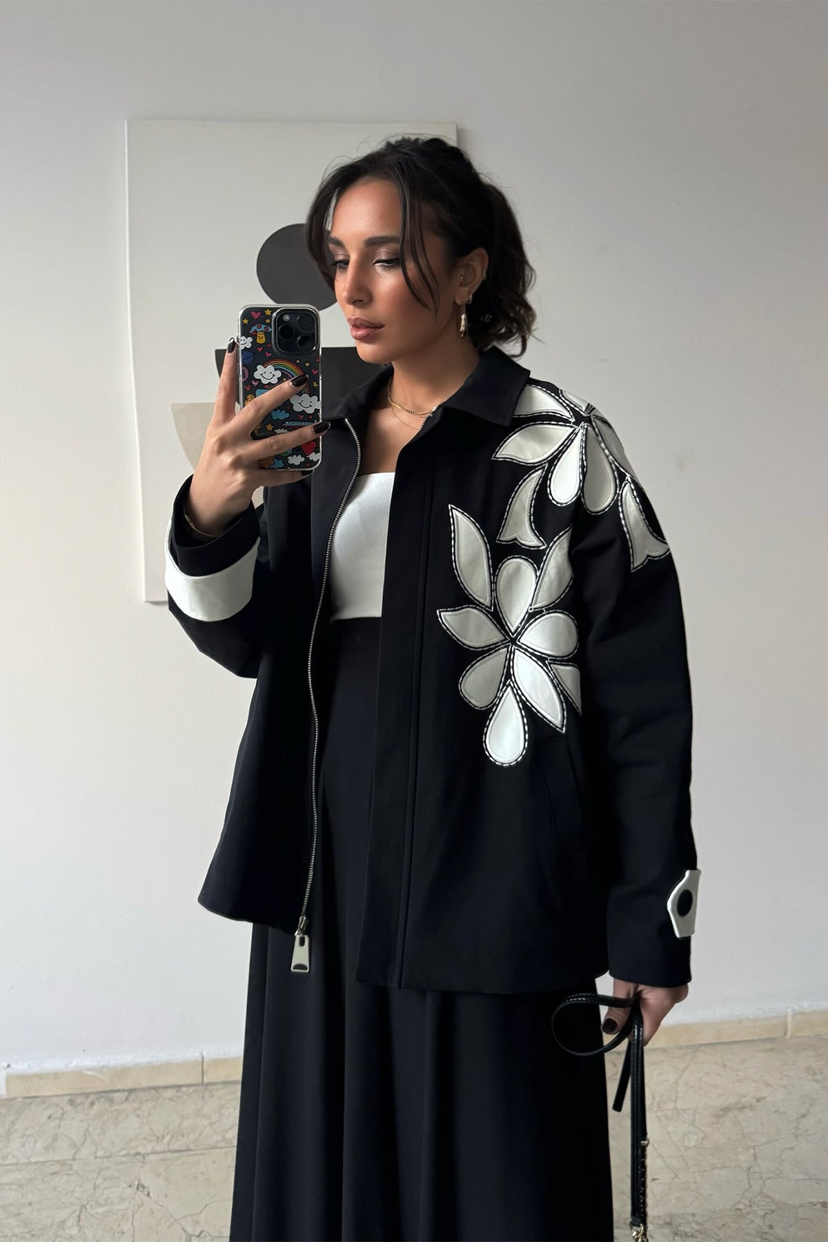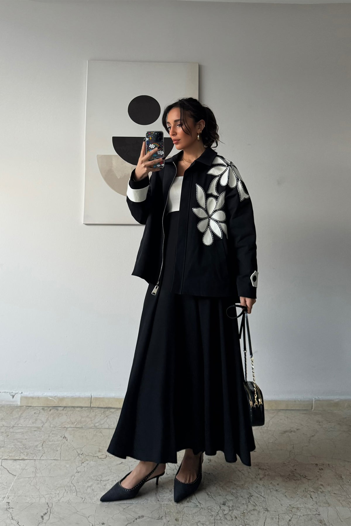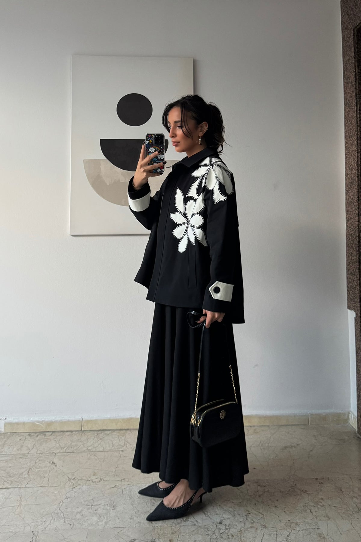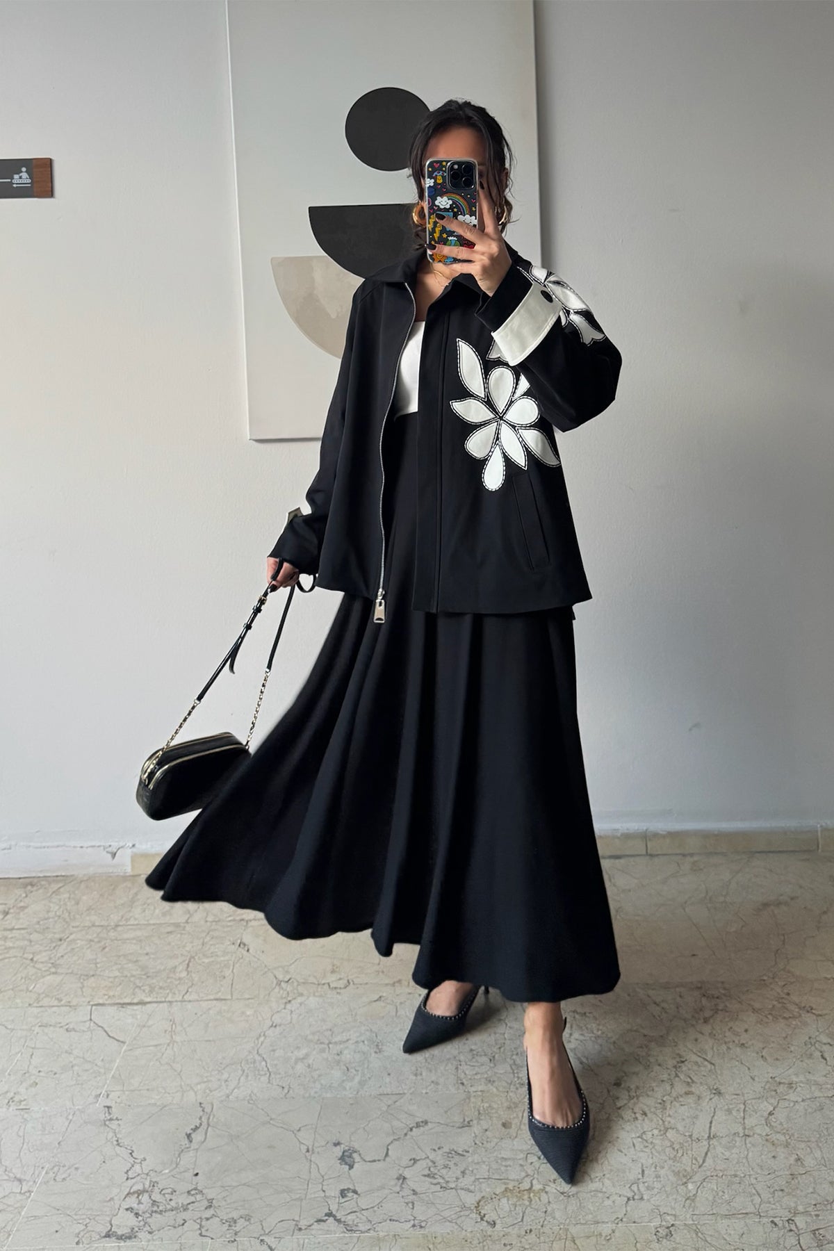 ÜRÜN AÇIKLAMASI: Zarif ve dikkat çekici bir duruş arayanlar için tasarlandı! beyaz çiçek aplikeleriyle stilinize enerjik bir dokunuş katar. %50 pamuk ve %50 likra karışımı kumaşıyla hem konforlu hem esnek bir kullanım sunar. Oversize yapısıyla modern şehir şıklığını yansıtır.