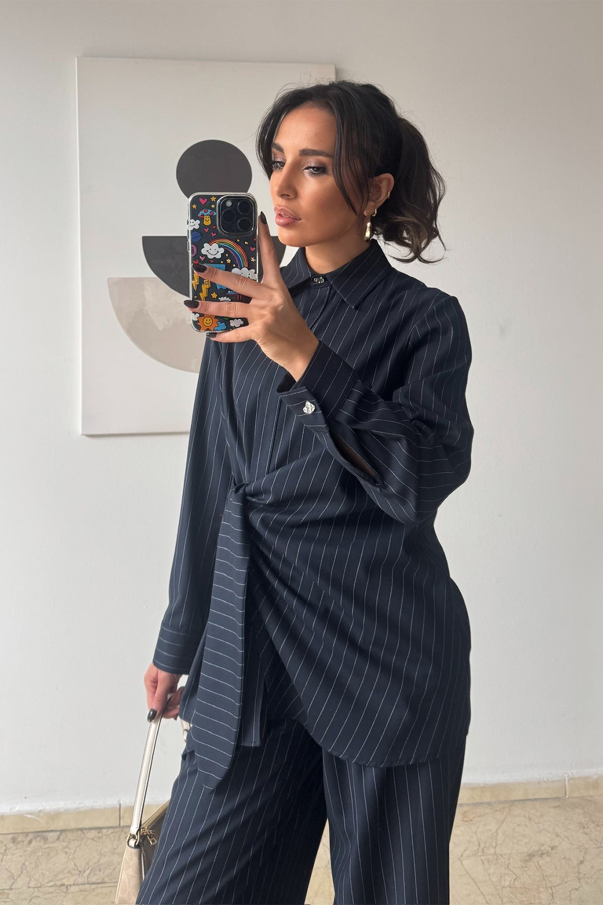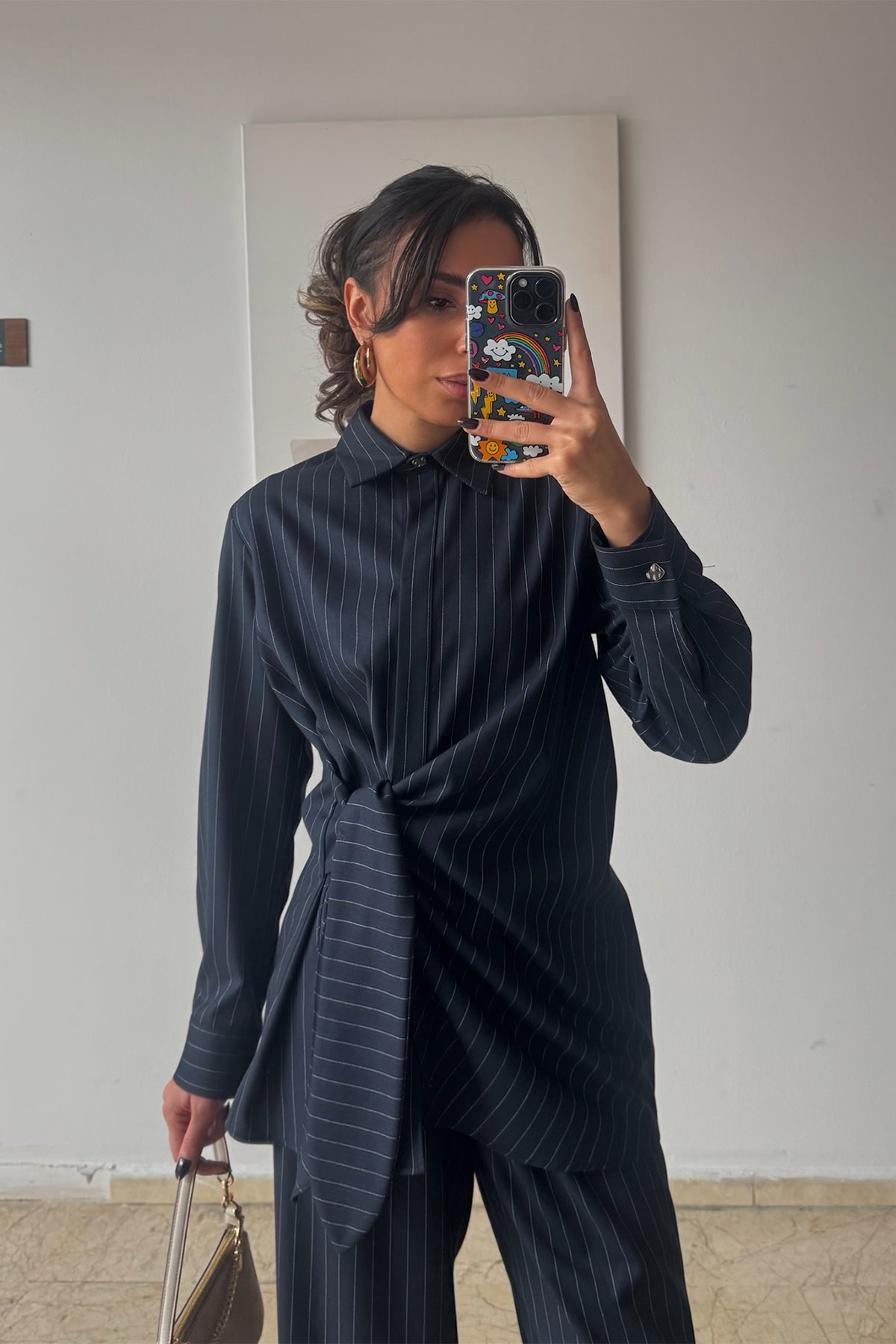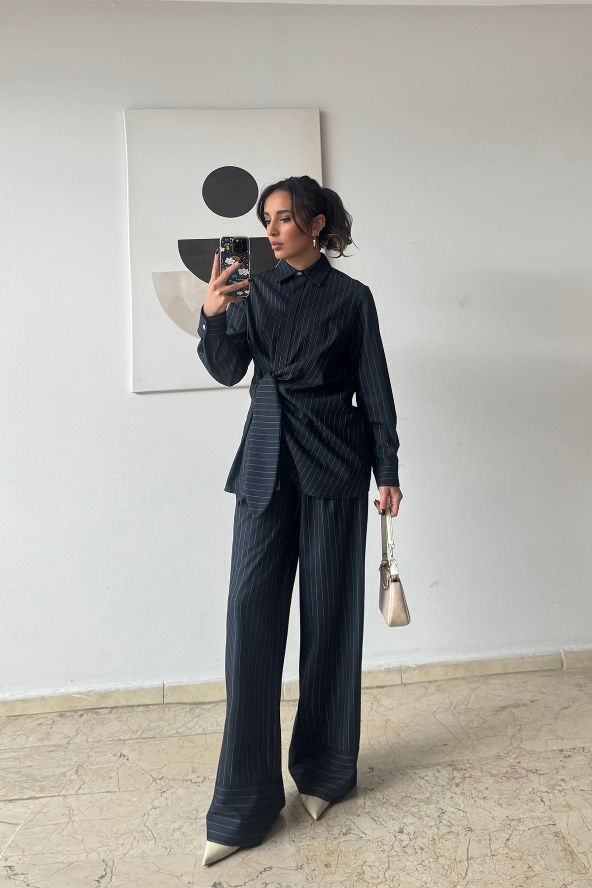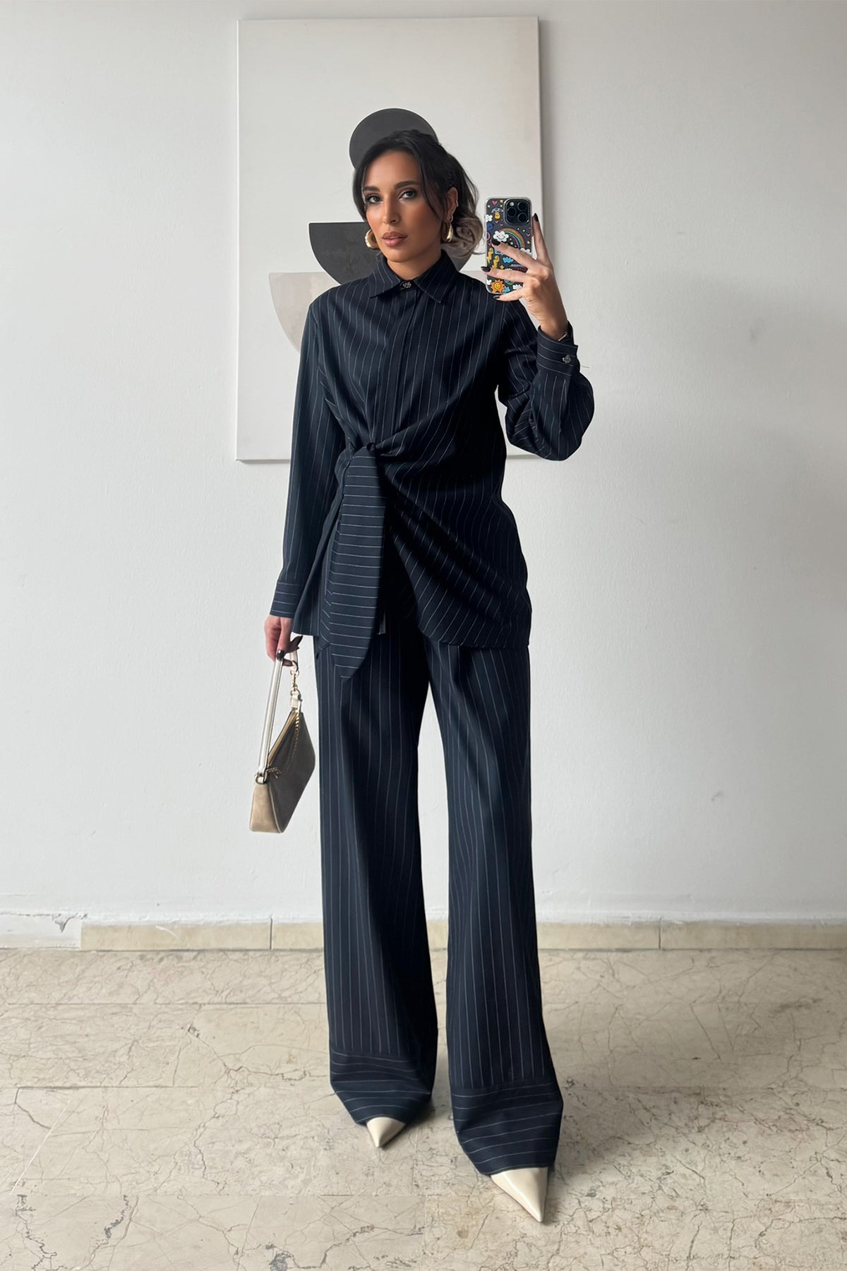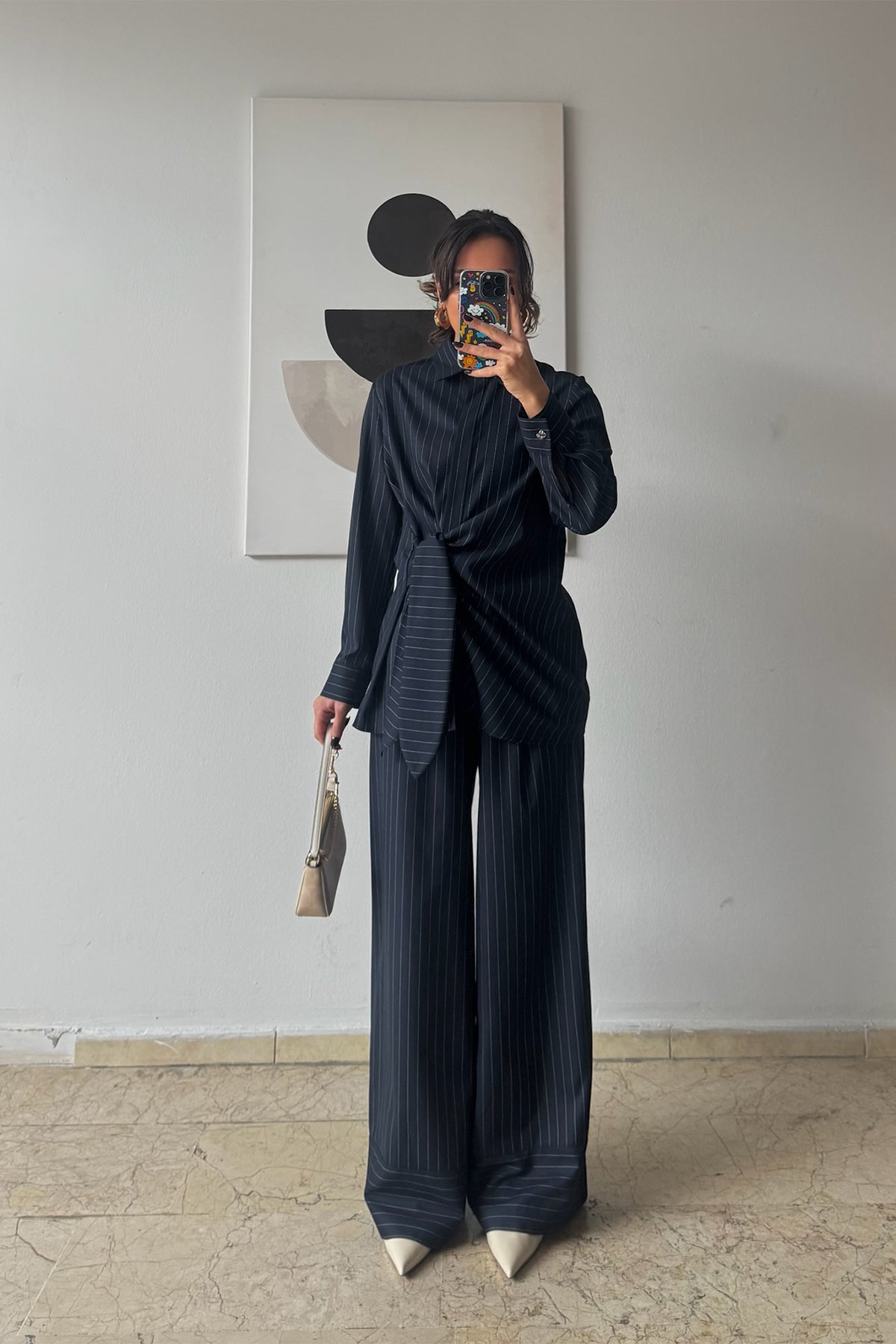 Modern tasarımı ve klasik çizgileriyle dikkat çeken bu bağlamalı takım, zarif detaylarıyla günlük şıklığı yeniden tanımlıyor. Gömlek formundaki üst parçası önden bağlamalı detayıyla özgün bir duruş sunarken, rahat kesimli pantolonu konforla şıklığı bir araya getiriyor.