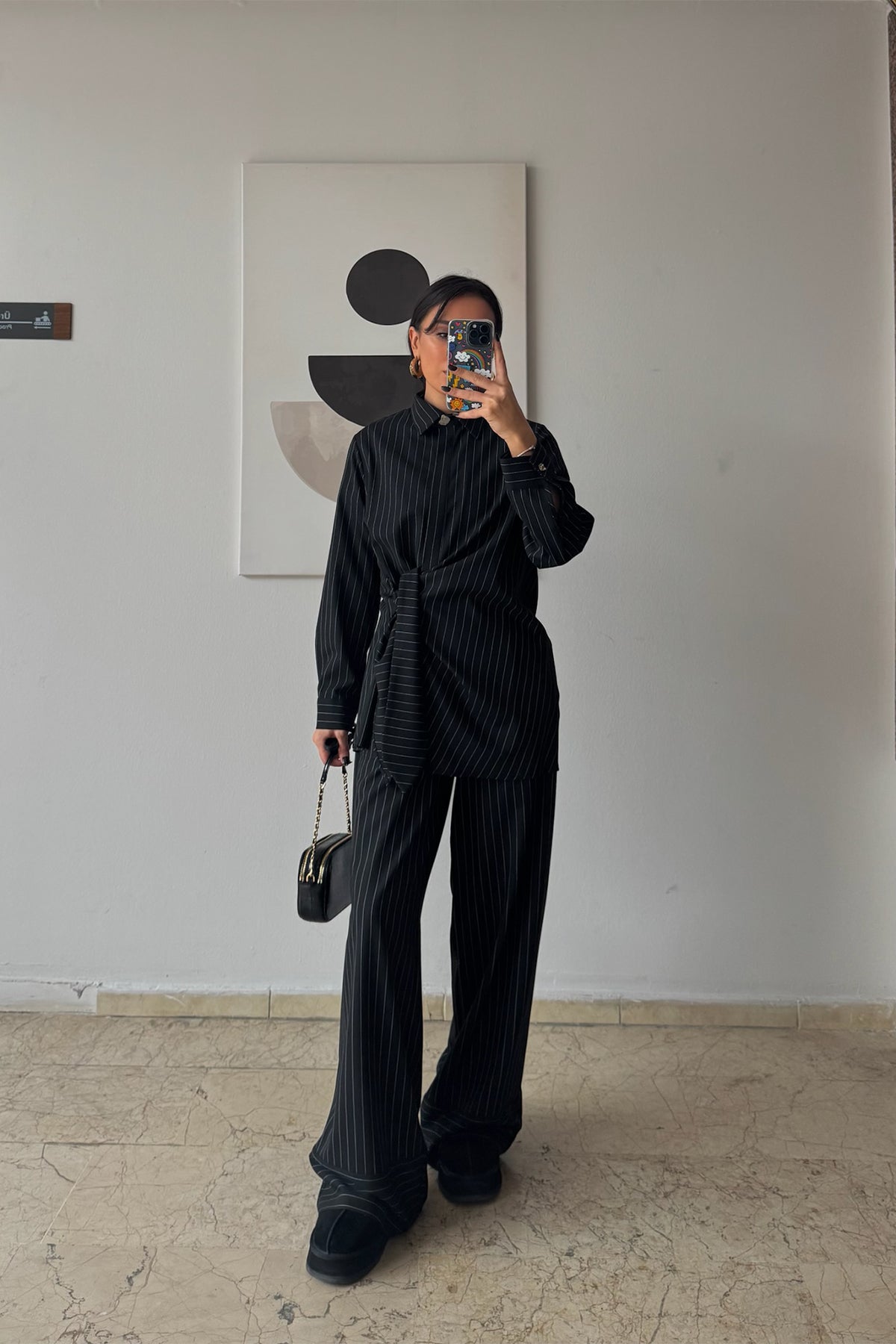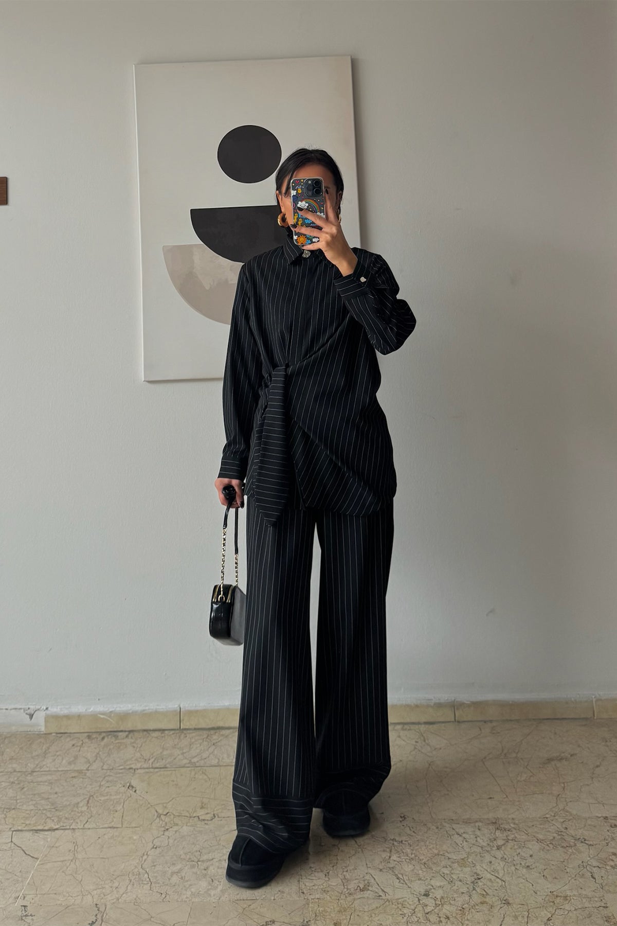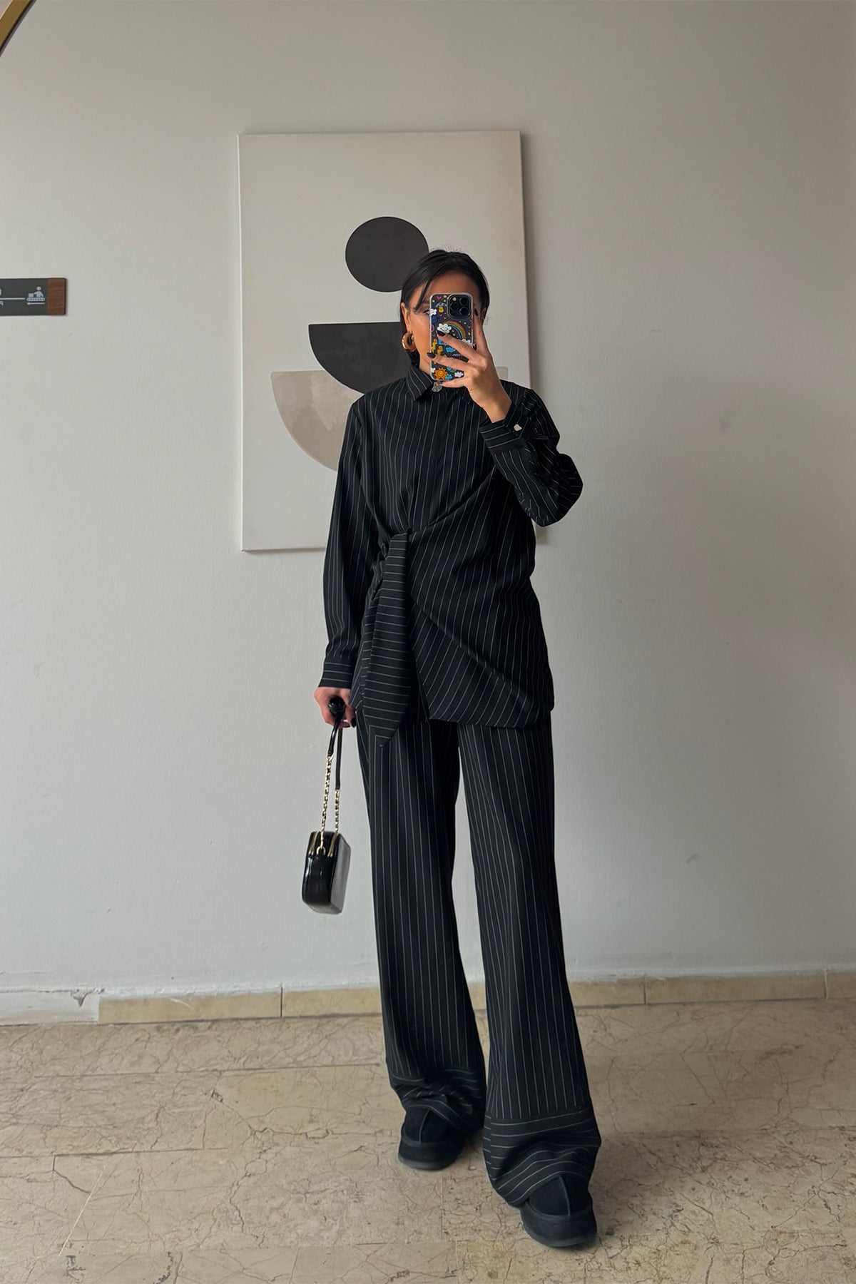 Modern tasarımı ve klasik çizgileriyle dikkat çeken bu bağlamalı takım, zarif detaylarıyla günlük şıklığı yeniden tanımlıyor. Gömlek formundaki üst parçası önden bağlamalı detayıyla özgün bir duruş sunarken, rahat kesimli pantolonu konforla şıklığı bir araya getiriyor.