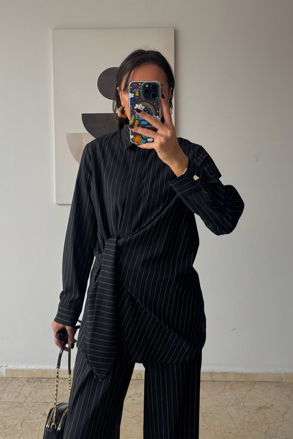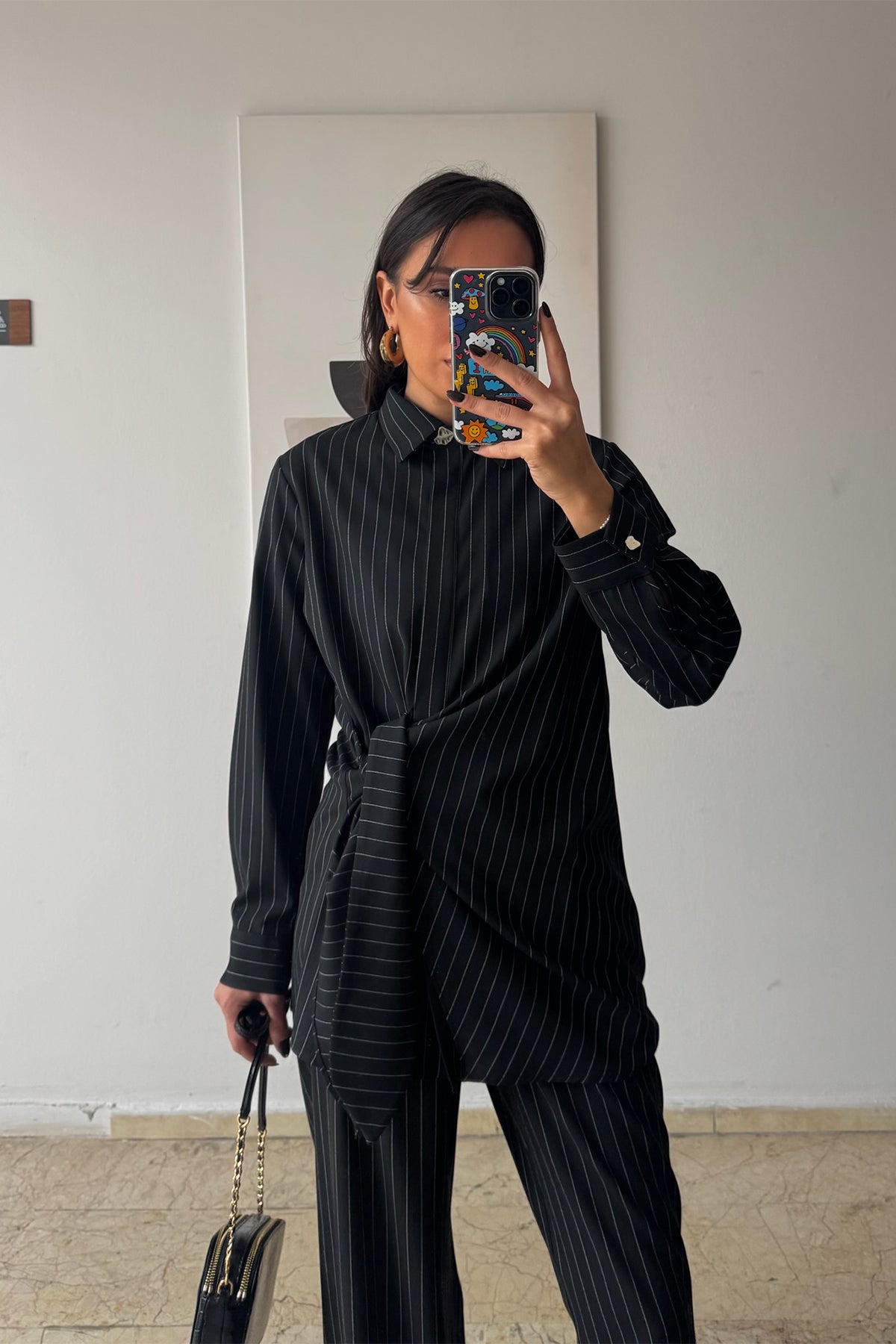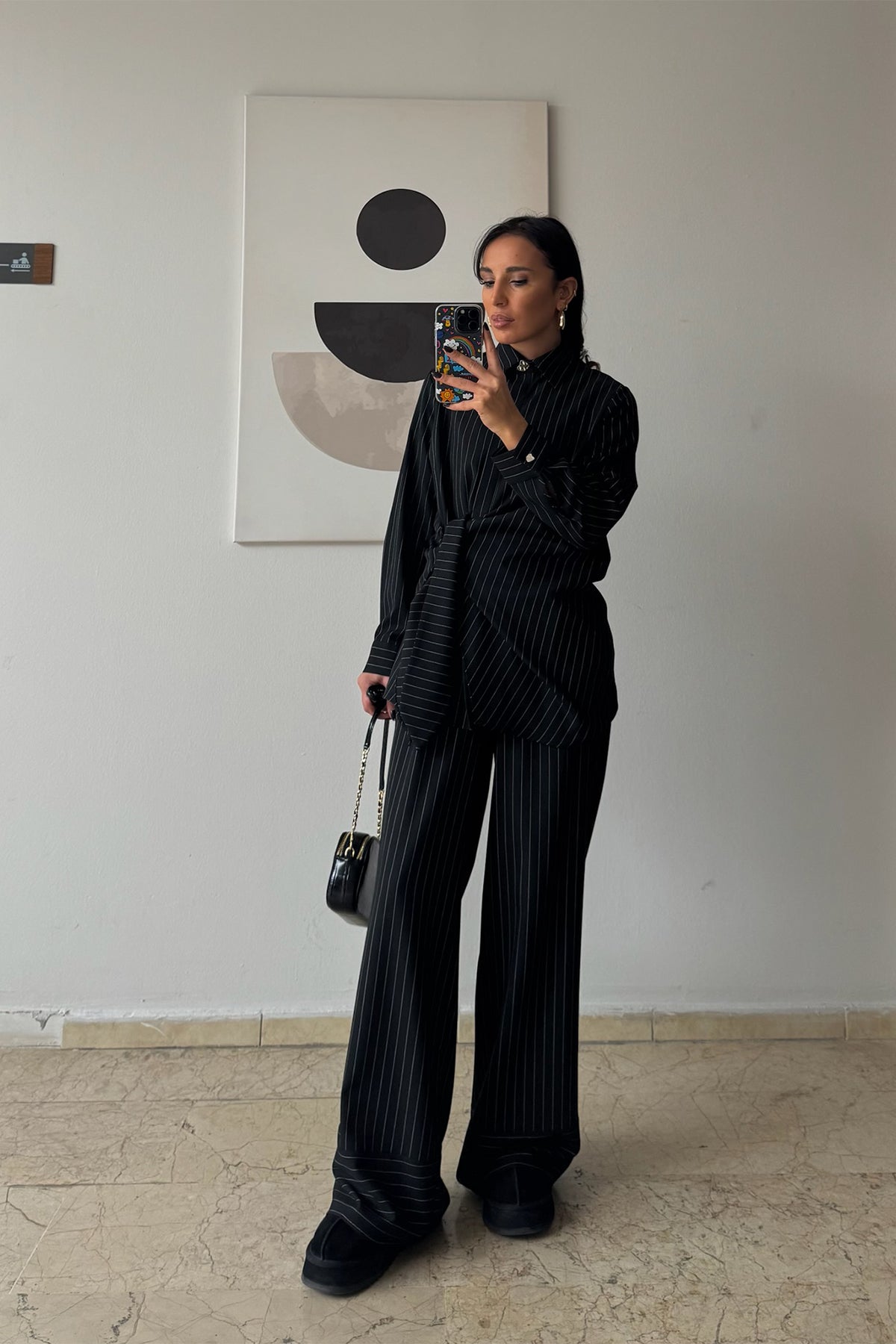 Modern tasarımı ve klasik çizgileriyle dikkat çeken bu bağlamalı takım, zarif detaylarıyla günlük şıklığı yeniden tanımlıyor. Gömlek formundaki üst parçası önden bağlamalı detayıyla özgün bir duruş sunarken, rahat kesimli pantolonu konforla şıklığı bir araya getiriyor.